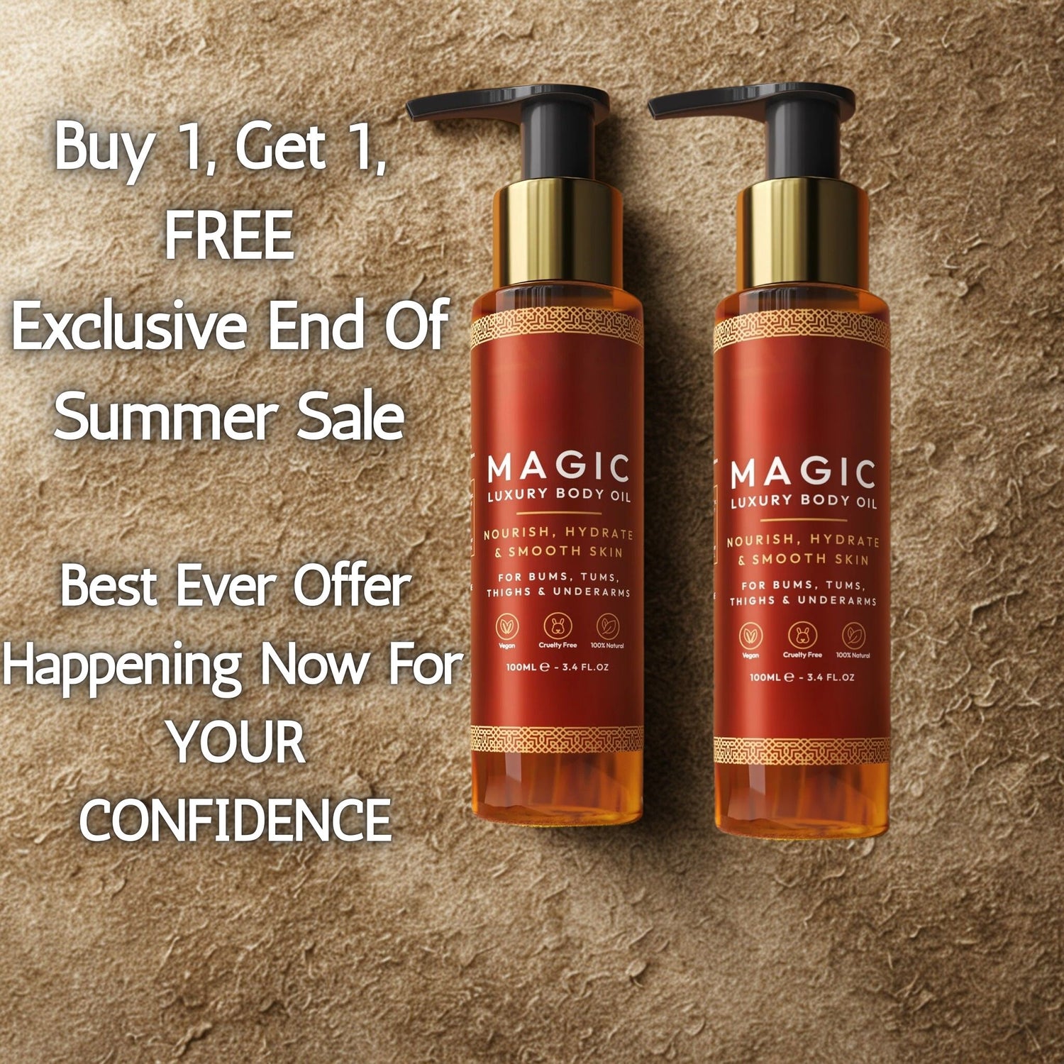 For a limited time, When you buy one of our amazing Body Oils, You'll get a second one absolutely free! That means double the daily confidence boost, Double the Cellulite Improvement, And double the loose skin tightening! Don't wait, this end-of-year sale won't last, And your Inconsistent skin will thank you.